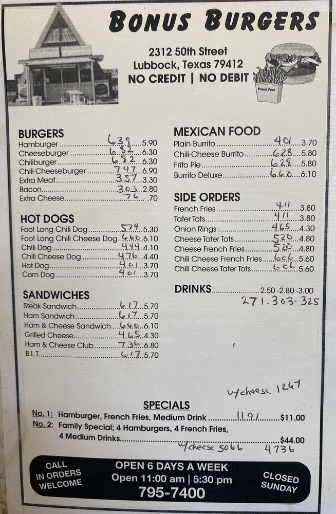 Introducing Bonus Burgers, an American restaurant located at 2312 50th St in Lubbock, TX. This family-friendly establishment offers a variety of options for all types of diners, including takeout, delivery, and outdoor seating. With a menu that caters to vegetarians and a range of amenities such as TV, Wi-Fi, and alcohol, Bonus Burgers has something for everyone. Whether you're looking for a quick lunch, a place to gather with friends, or a convenient drive-thru option, this restaurant has you covered. The moderate noise level and bike parking make it a versatile choice for various occasions. With attentive waiter service and the option to make reservations, your dining experience at Bonus Burgers is sure to be enjoyable. Call (806) 795-7400 to make a reservation or simply stop by to experience their delicious menu firsthand.